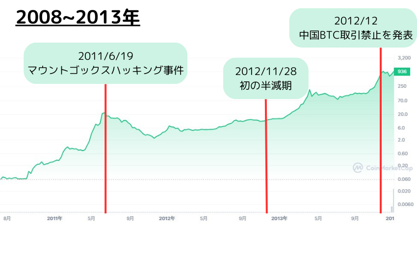 2011年にマウントゴックスのハッキング事件などネガティブ材料があったにも関わらず、2013年には1100ドルを超えました。