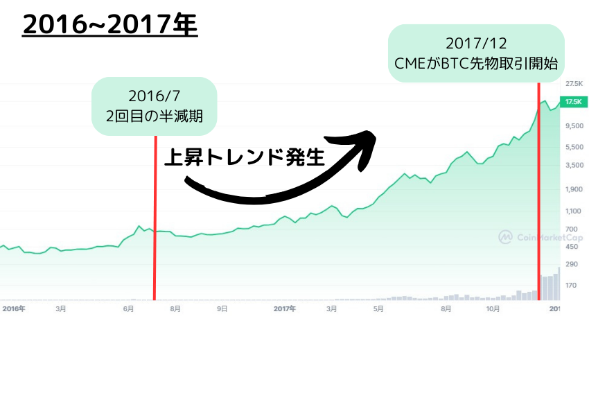 2015年末から少しずつ復調の兆しがあったビットコインですが、2016年7月に2度目となる半減期を迎えて上昇トレンドへ転換するきっかけとなりました。