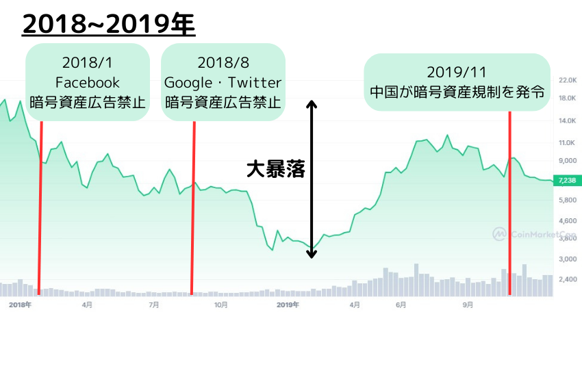 2017年まではさまざまな明るいニュースで賑わっていたビットコインですが、Facebook・Google・Twitter(現X)が立て続けに暗号資産関連の広告掲載を禁止する措置をとりました。