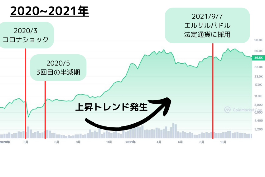 しかし、その後の大規模な金融緩和政策などが追い風となり、ビットコインへの資金流入が増え続け、2020年5月には3度目となる半減期を迎えました。