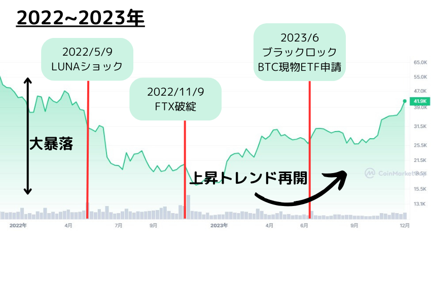当時世界第2位の規模であった仮想通貨取引所FTXの破綻などもあり、ビットコインは2022年11月に16000ドルまで下落しました。