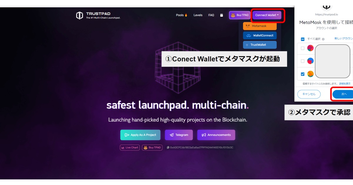 まずは、公式サイトの「Conect Wallet」で、購入したTPADが保管されているメタマスクなどのウォレットとTrustPadを接続します。