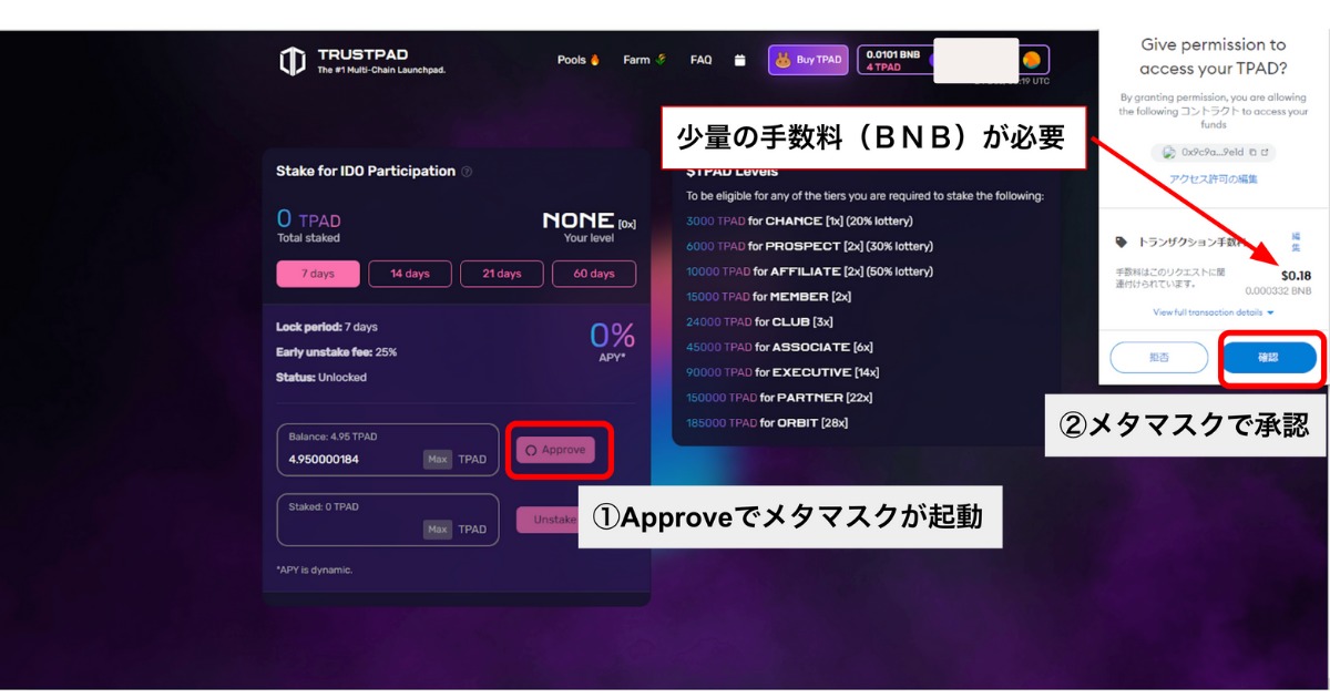 TPADをPancakeSwapなどで購入して、TrustPadのプラットホームにステーキングすることで、TrustPadは、ユーザーに購入権利やセールへの参加権利を付与します。
