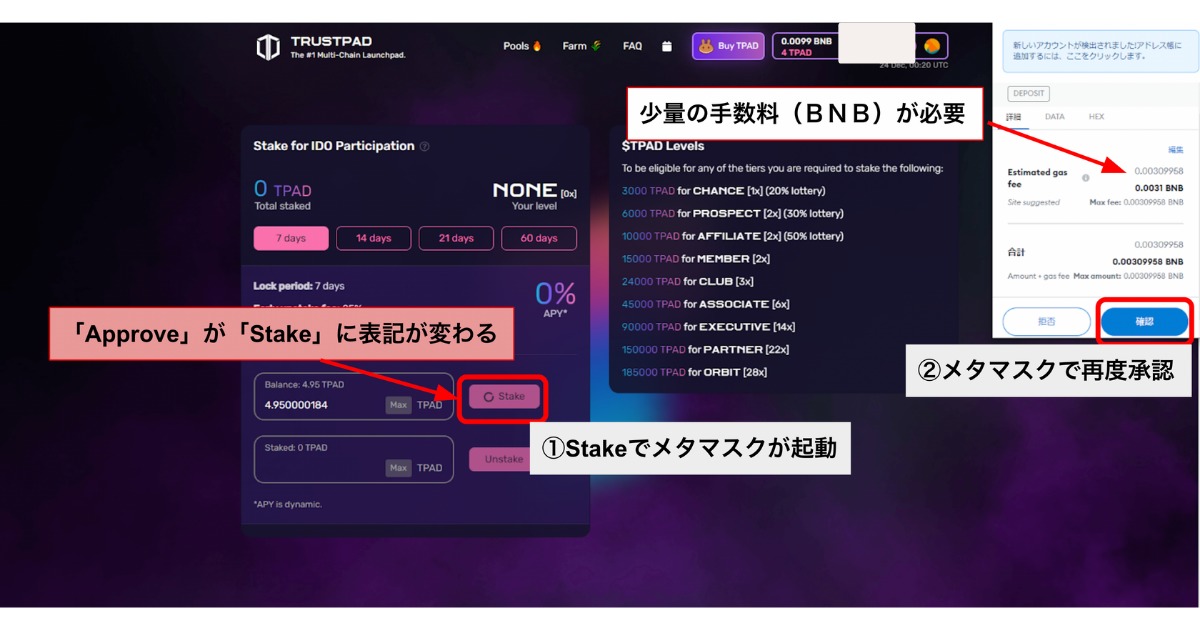 ステーキング途中で何度かメタマスクなどで承認作業が必要です。