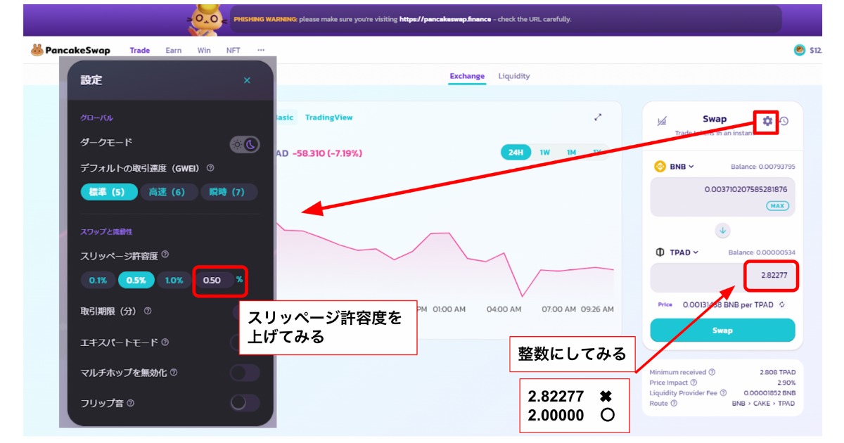 - 設定画面でスリッページを上げてみる(少しずつ)