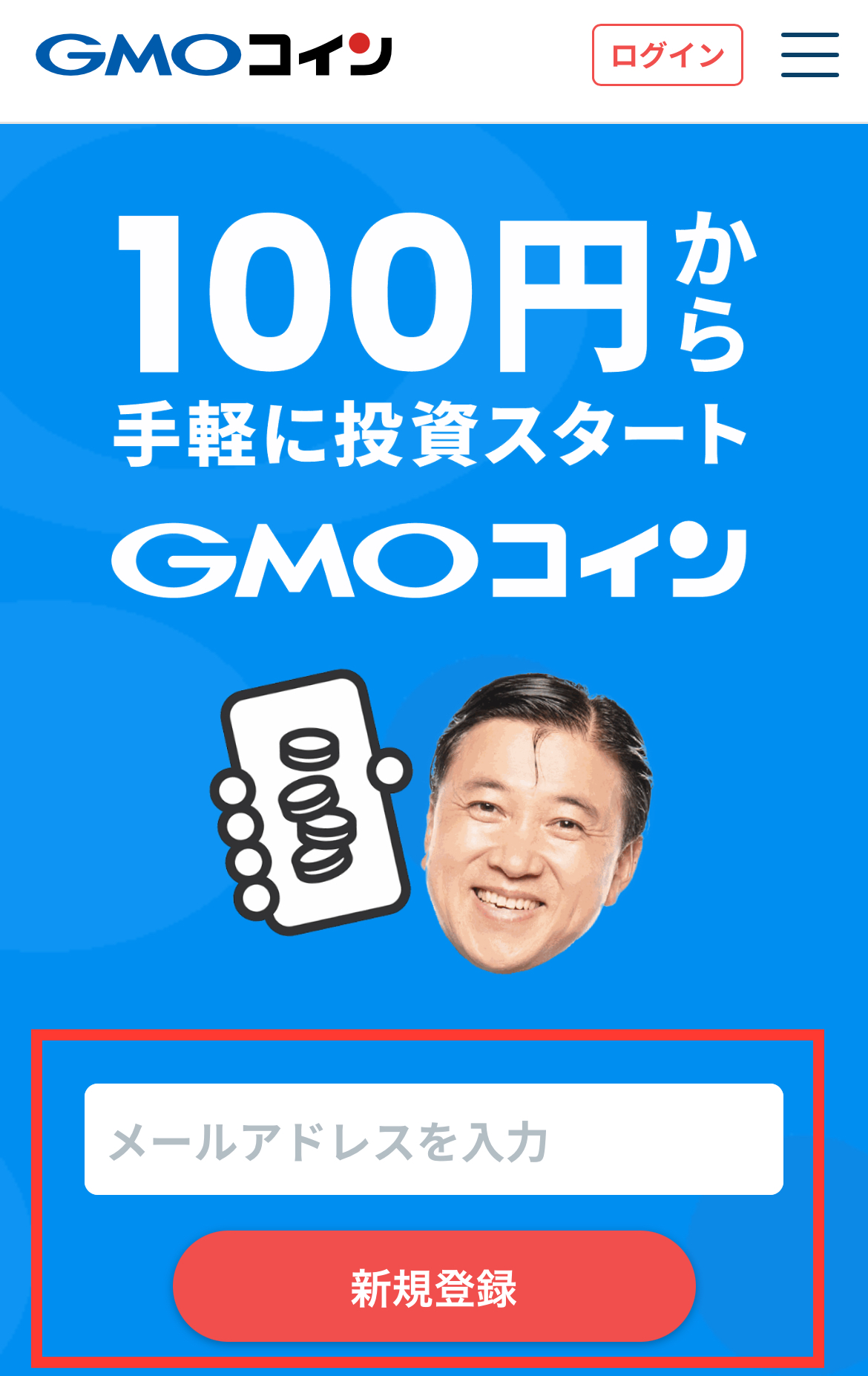 公式サイトのトップページにアクセスすると、メールアドレスの入力欄が表示されるので、ご自身のメールアドレスを入力して「新規登録」をタップします。