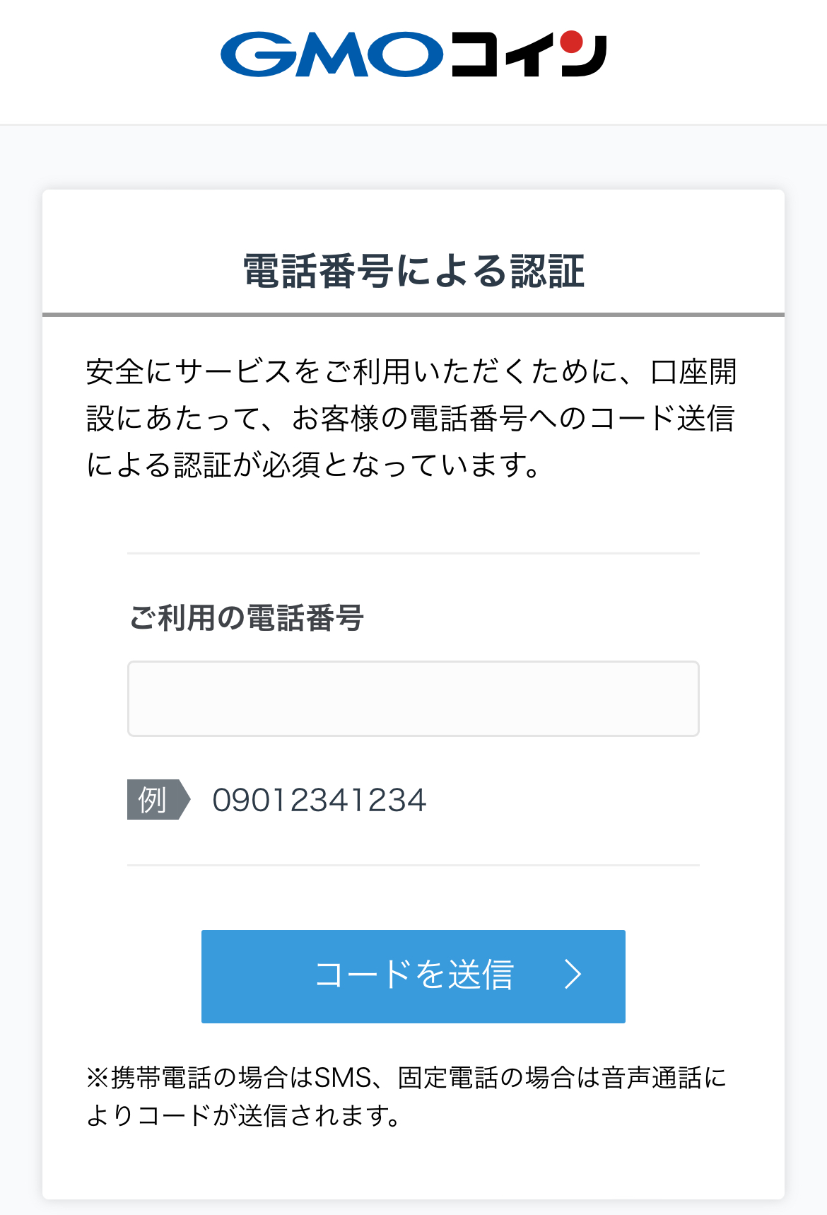 ログインすると、電話番号による認証画面が表示されるため、自分の携帯電話番号を入力して、「コードを送信」をタップします。