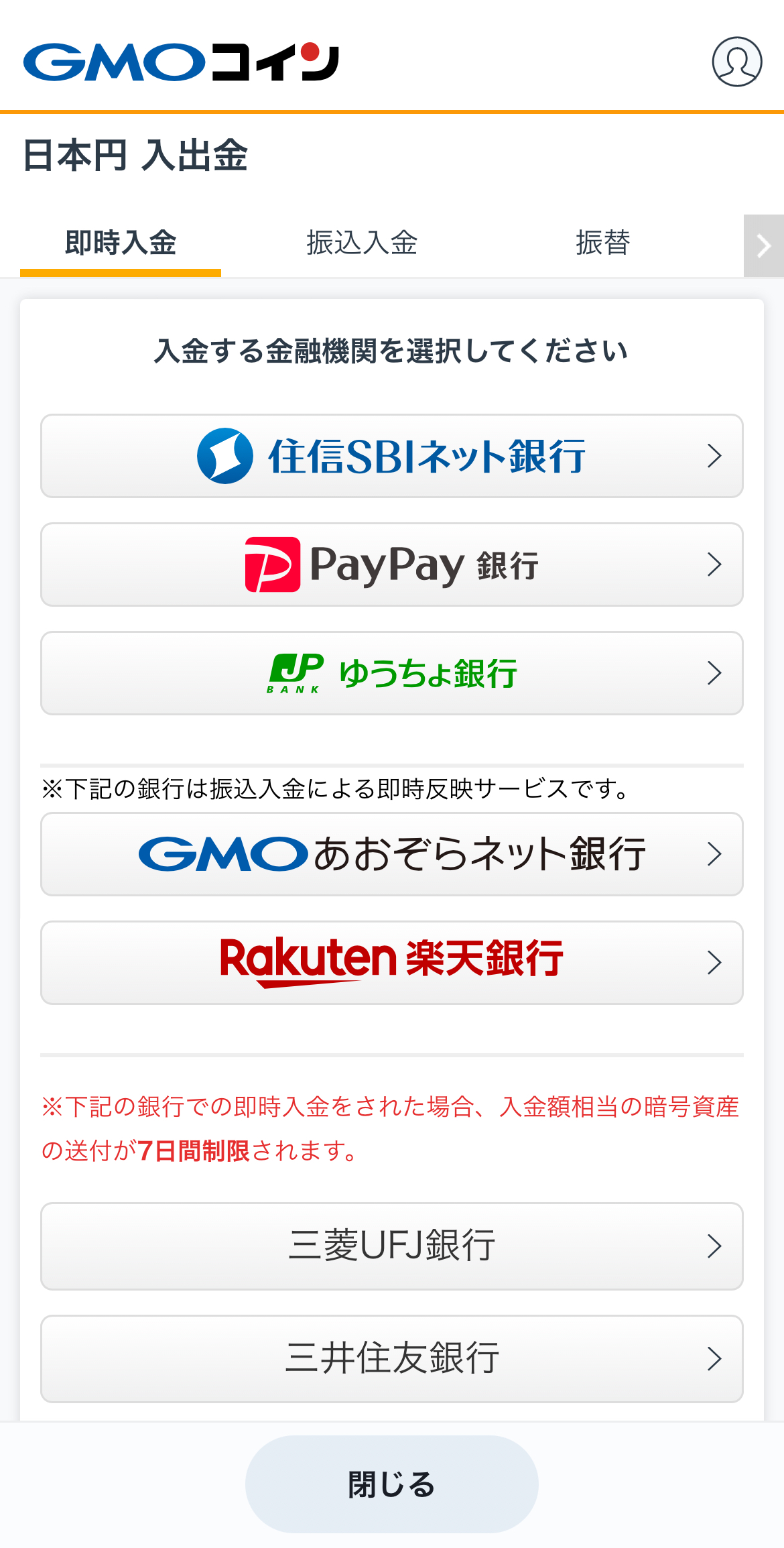 楽天銀行、住信SBIネット銀行、PayPay銀行、ゆうちょ銀行などの提携金融機関からの「即時入金」が便利で手数料も無料です。