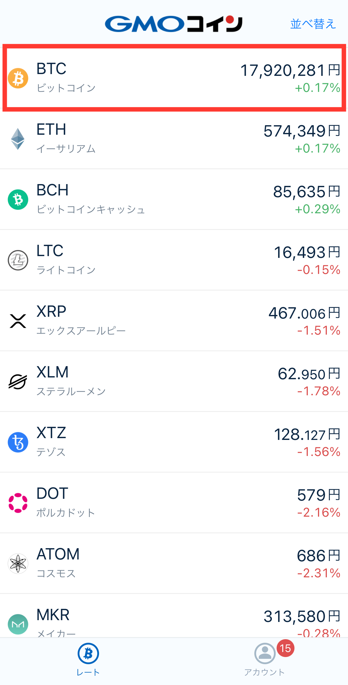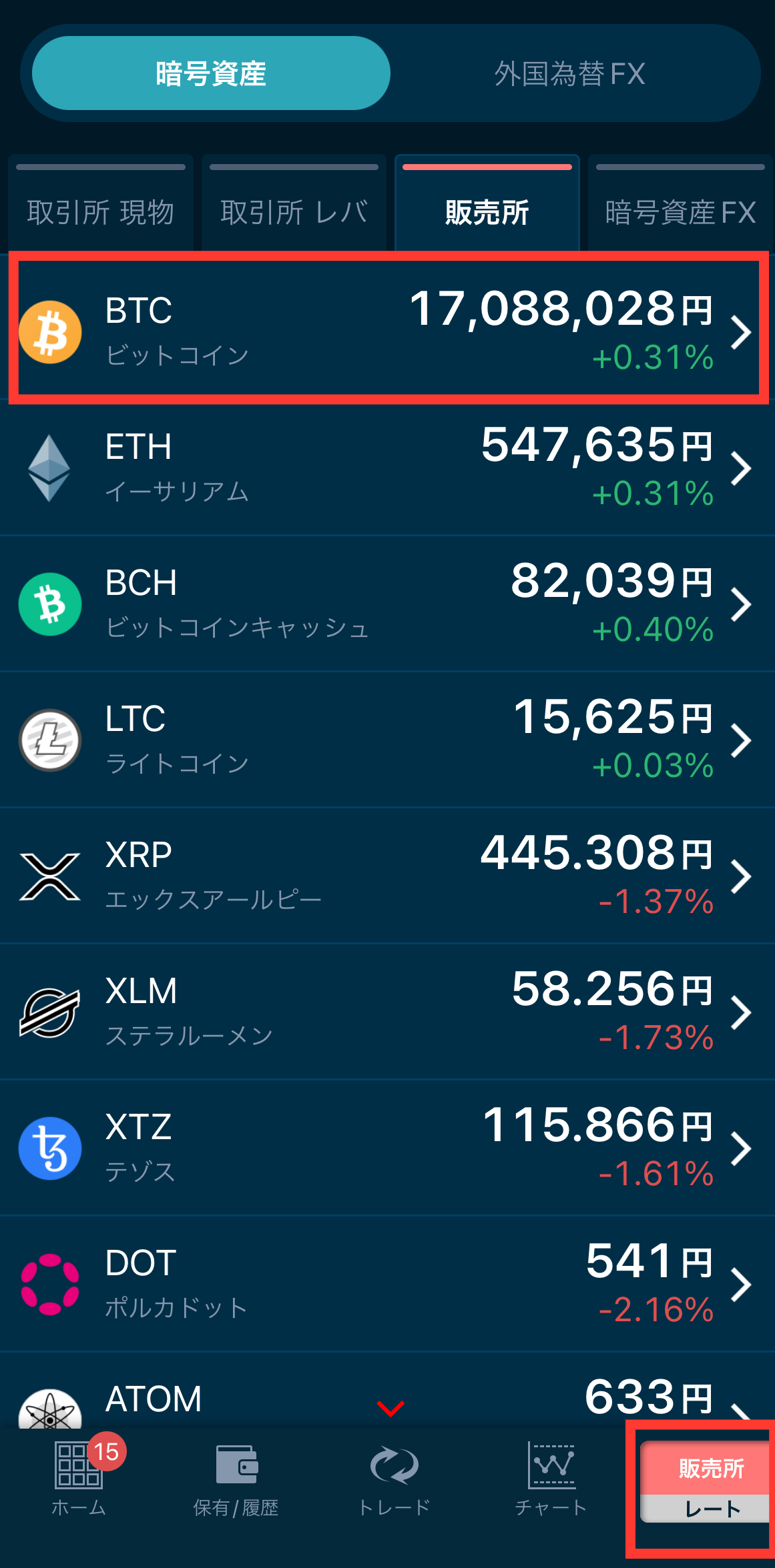 画面右下のアイコンをタップして取引所や販売所での銘柄の価格一覧を表示します。