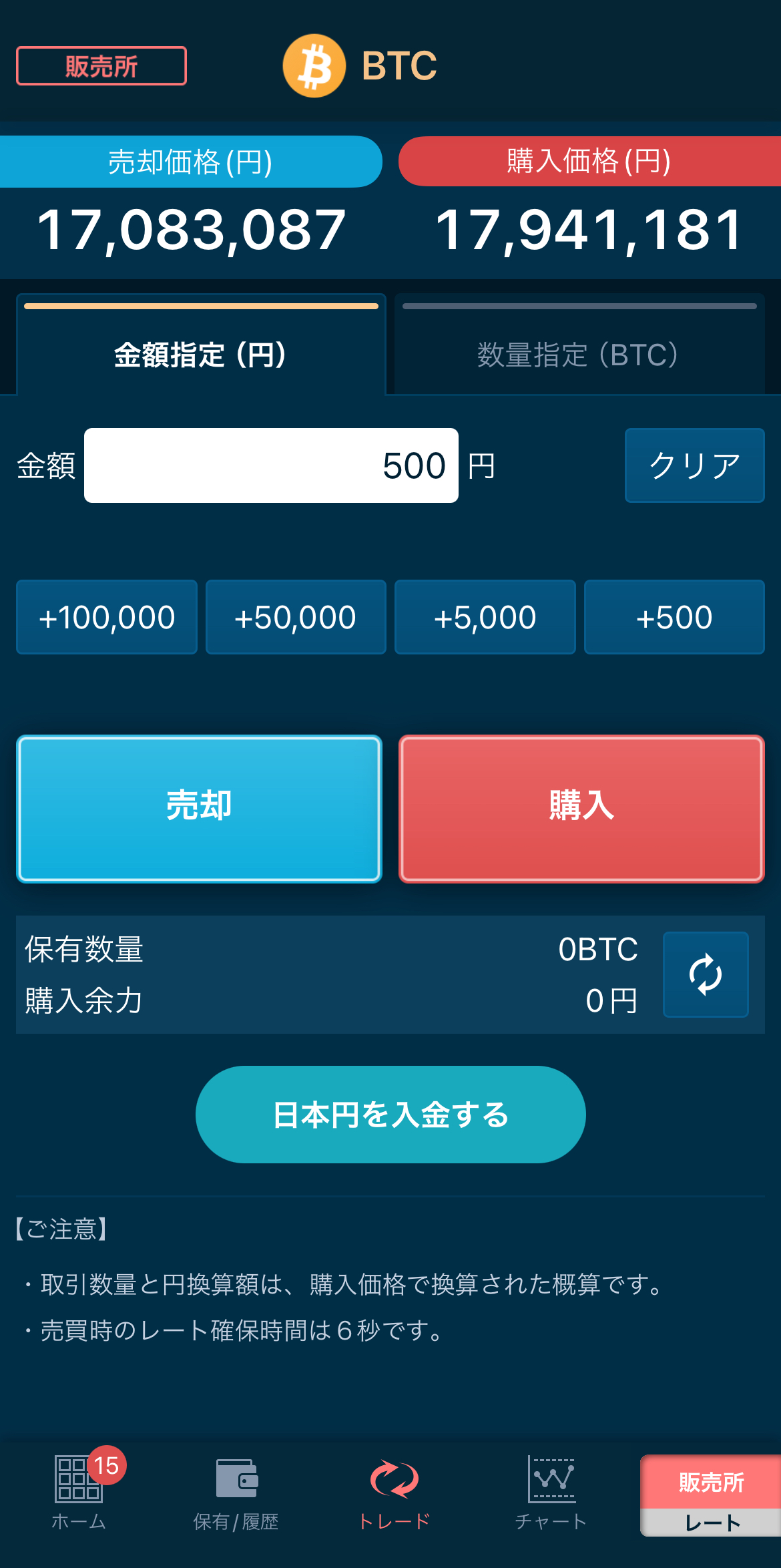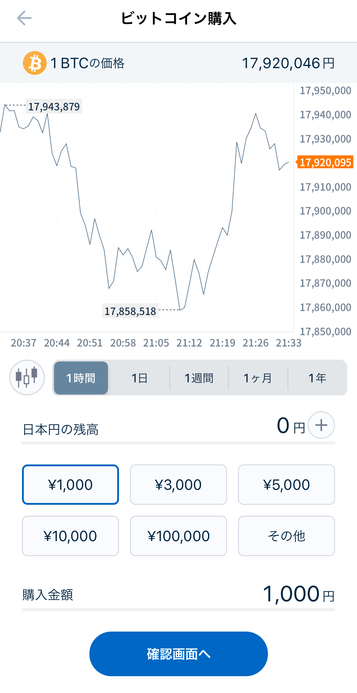 - 購入したい金額(日本円)または数量(BTC)を入力します。「1,000円分」のように、少額から購入可能です。
