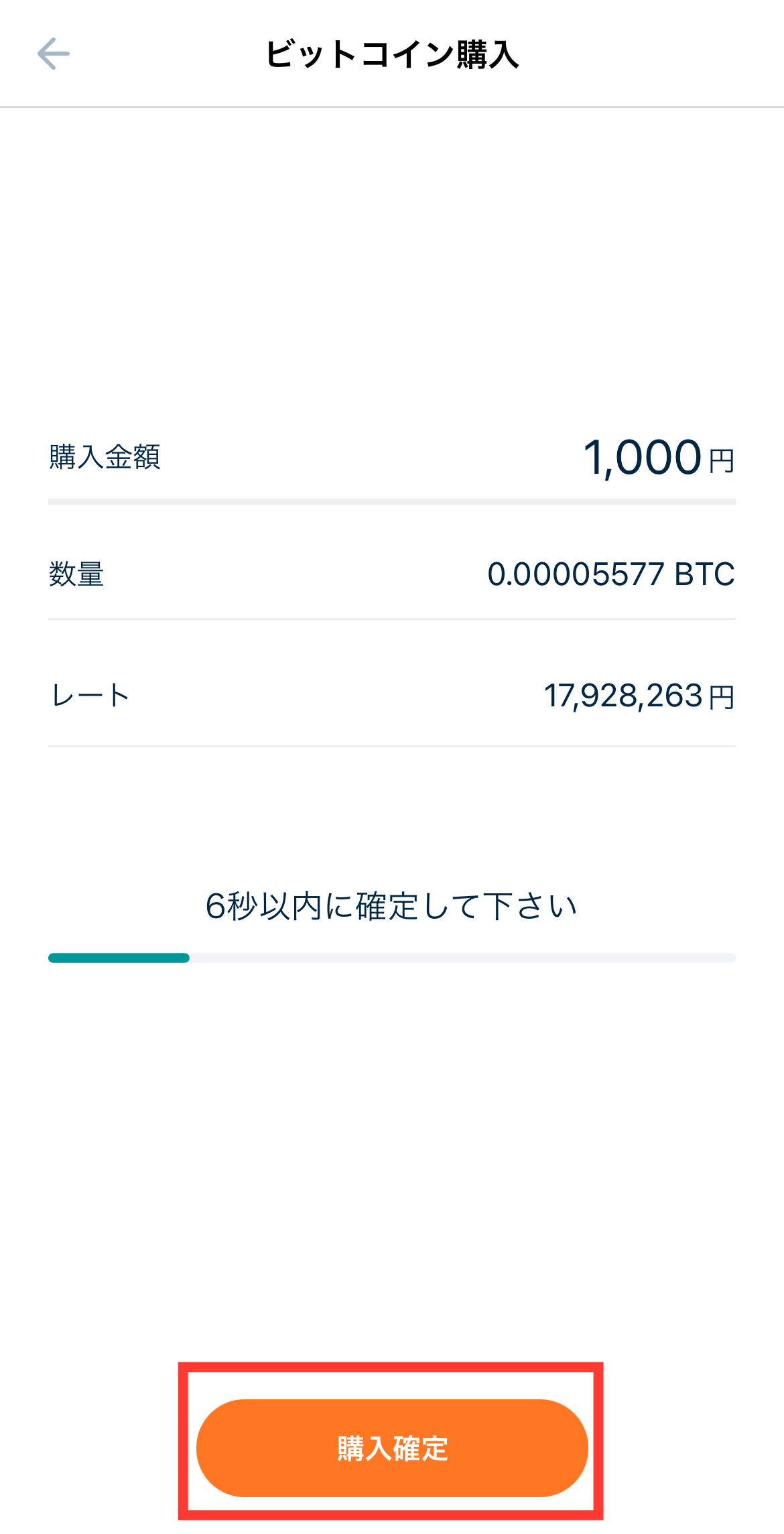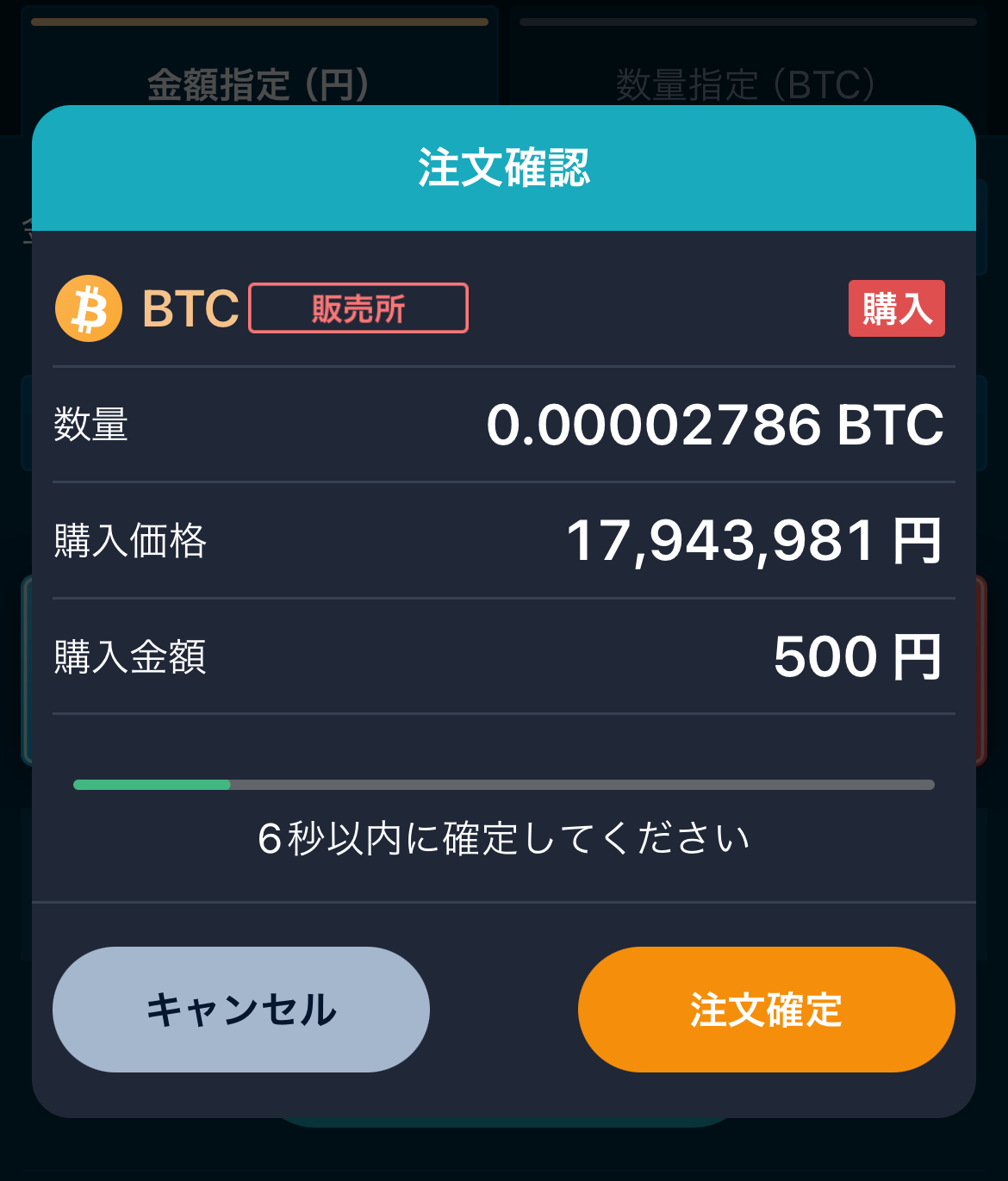 入力内容を確認し、「購入確定」ボタンをタップするとビットコインが購入されます。