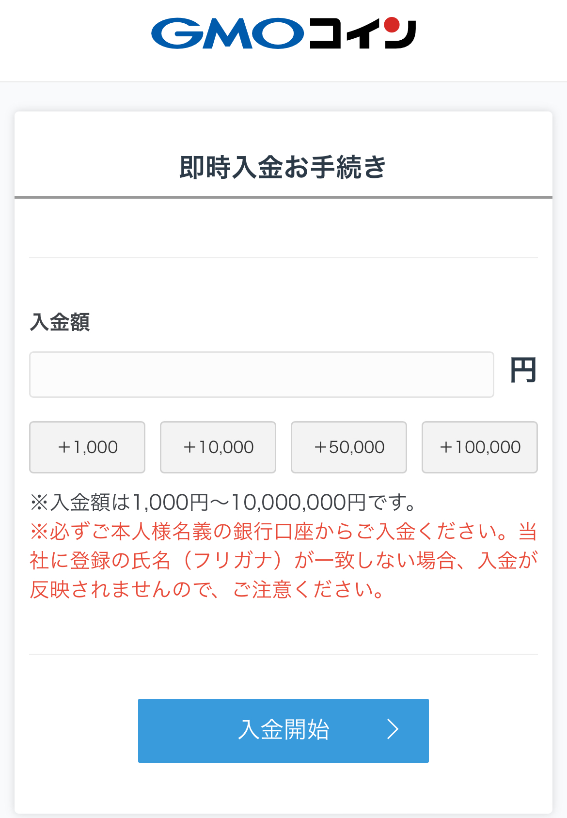 まずは、仮想通貨を購入するための資金となる日本円を入金しましょう。