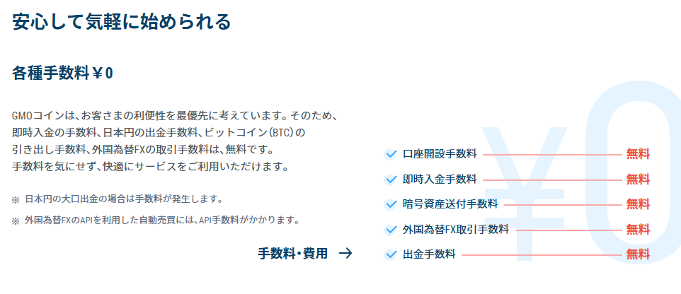 GMOコインは、この手数料が業界最安水準であり、特に以下の手数料が「無料」である点が大きな強みです。