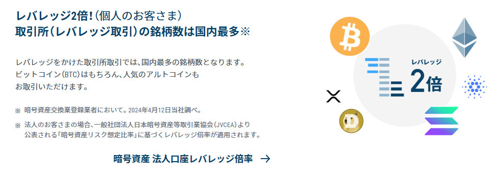 2025年7月時点で22銘柄を取り扱っており、取引銘柄数だけではbitbankやコインチェックの方が多いですが、GMOコインはレバレッジ取引ができる銘柄数が国内最多です。