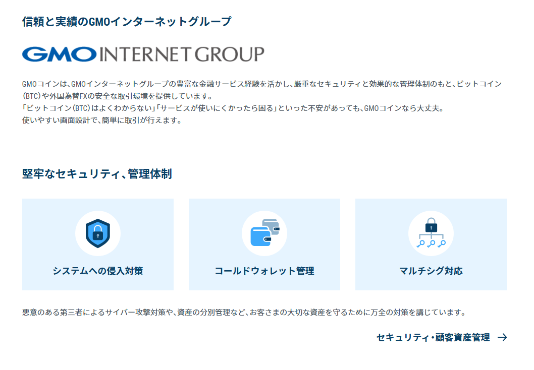 GMOグループは、インターネットインフラ事業や金融事業で長年の実績があり、そこで培われたセキュリティ技術や運営ノウハウがGMOコインにも活かされているため信頼できます。